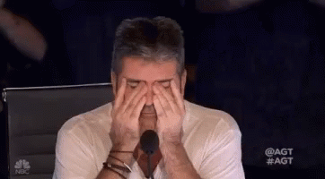 Simon Cowell reacts with an 'Oh No' moment, rubbing his eyes in apparent exasperation or tiredness.