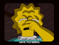 Lisa Simpson crying with tears streaming down her face, saying 'Maggie, you can have my books.'