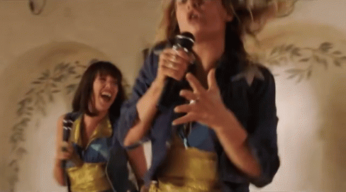 Lily James passionately sings into a microphone, while another woman cheers in the background, likely from Mamma Mia.