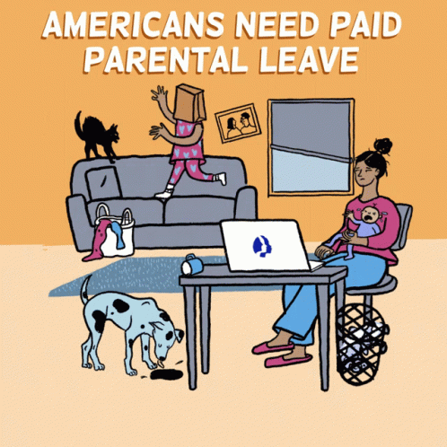 An illustration highlights the need for paid parental leave for Americans, showing a single mom struggling to work from home with a baby and chaotic household.