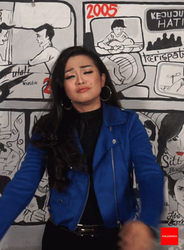 Fitri Carlina expresses emotion, hugging herself in a blue jacket against a music-themed mural.