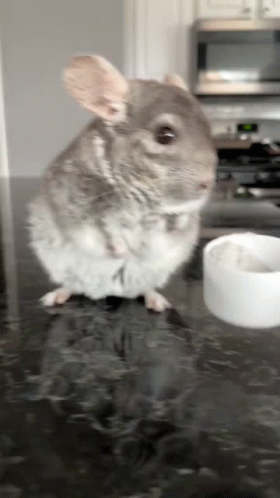 A chinchilla enjoys a dust bath on a kitchen counter, rolling in the fine white powder.