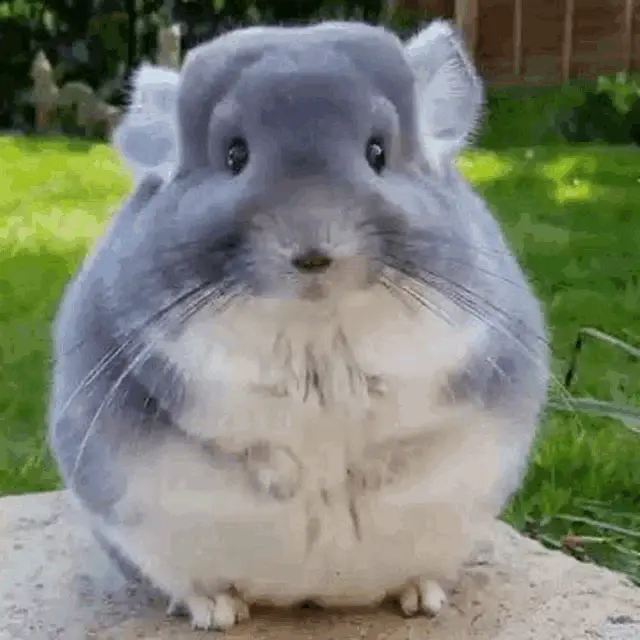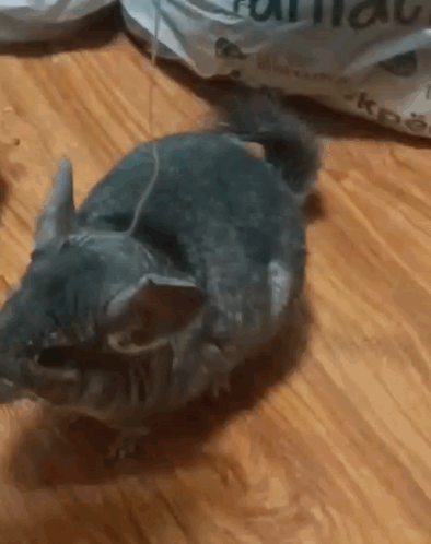 Chinchilla Shushik on a wooden floor, looking up and interacting with a hand.