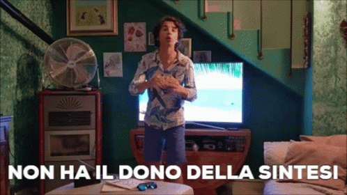 Luca Mignacco speaks in a living room, with the Italian text 'Non ha il dono della sintesi' (Does not have the gift of synthesis) displayed.