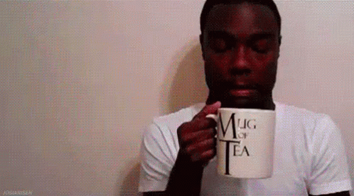 A man sips tea from a white mug with 'Mug of Tea' printed on it, looking around thoughtfully.
