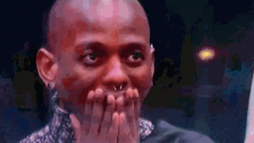 Sis Tamara, a bald person with piercings, reacts with surprise and then wide-mouthed excitement on BB Mzansi.
