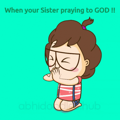 A cartoon sister kneels in prayer, showing a range of emotions from hopeful to worried as she prays to God.