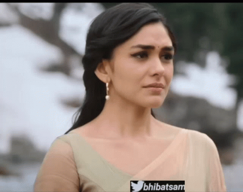 Mrunal Thakur portrays an emotional moment, crying in a close-up scene from the film Sita Ramam.