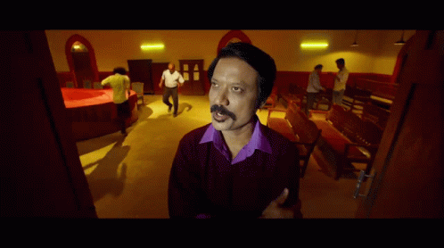 S.J. Surya, wearing a purple shirt, smiles in a scene from a film, set in a hall with red accents.