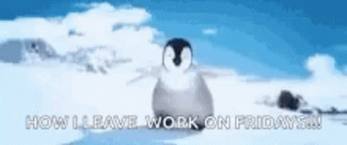 A penguin slides across an icy landscape with the caption 'HOW I LEAVE WORK ON FRIDAYS'.
