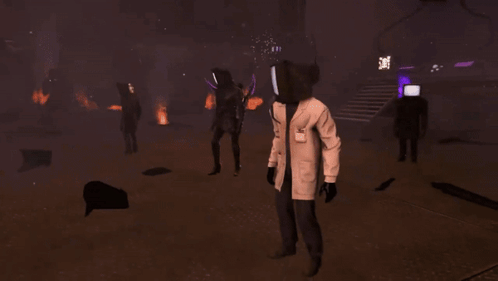 A group of TV men and a scientist TV man gather in a dark, smoky environment with glowing elements.
