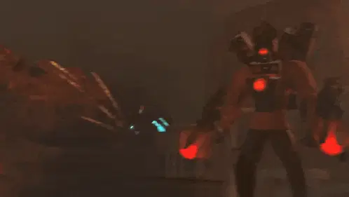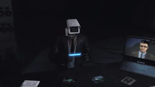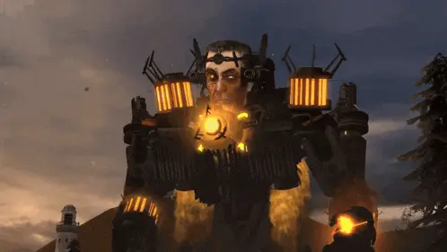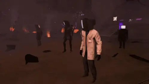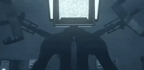 The Upgraded Titan TV Man from Skibidi Toilet 77 Part 3 emerges with glowing purple lights.
