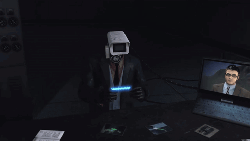 The Lucky Cameraman agent from Skibidi Toilet Season 25 sits at a desk with a laptop, looking down.