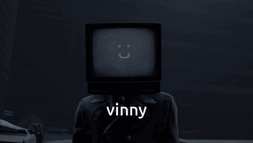 Vinny, the Skibidi Toilet TV man, stands with a smiley face on his screen in a dark setting.