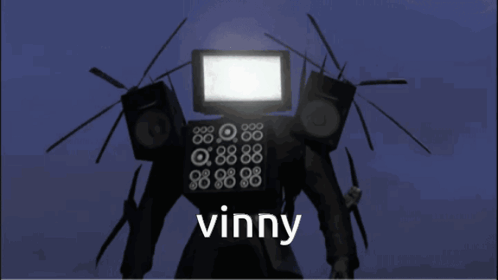 The Skibidi Toilet Tvman character, featuring a screen head, displays 'vinny' text and a sad face.