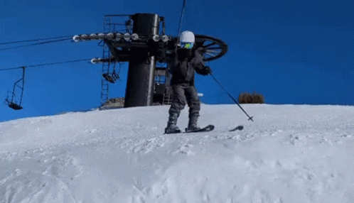Justin Wong skiing down a snow-covered slope, performing a pole whack near a ski lift.
