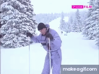 Ljubisa Samardzic and Branka Pujic in a skiing accident, with Branka taking a comical fall on the snowy slopes.