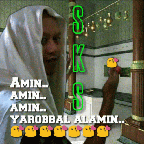 A man in traditional attire offers a prayer with 'Amin Yarobbal Alamin' and 'SKS' text overlay.