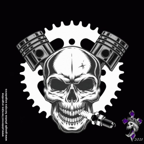 An intricate graphic design featuring a skull with pistons and a spark plug, set against a gear, evoking a motorcycle theme.
