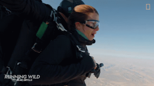 Danica Patrick skydives with an instructor over a desert landscape as part of the show "Running Wild with Bear Grylls."