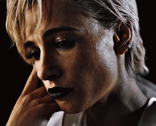 Skye Riley, portrayed by Naomi Scott, in a dramatic close-up from Smile 2, with dark makeup and intense lighting.