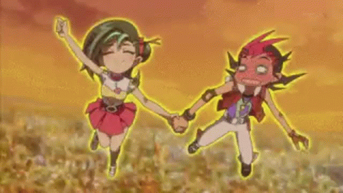 Yuma Tsukumo and Kotori Mizuki (Tori Meadows) from Yu Gi Oh Zexal hold hands and float happily in the sky.