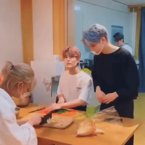 Stray Kids members cooking in the kitchen, preparing food with face shields on.