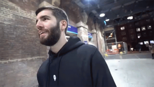 Zerkaa, a man with a beard and black hoodie, slaps the camera away in a public indoor setting.