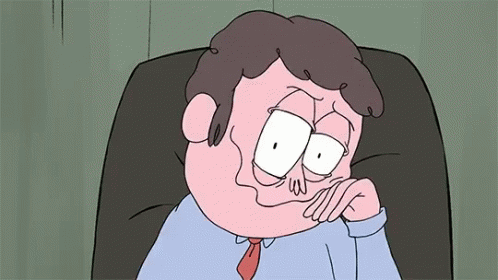 A cartoon man from 'Rachel And Her Grandfather Control The Island' sits in a chair and slaps himself.
