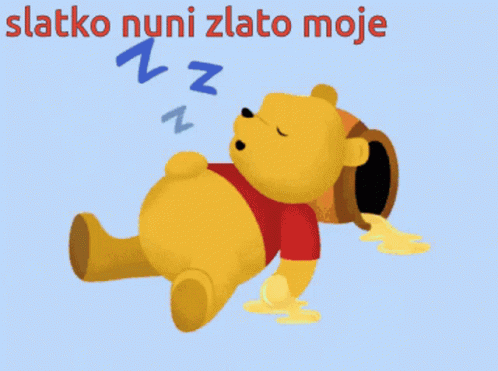 Winnie the Pooh sleeps soundly with honey spilling, accompanied by the Serbian phrase 'Slatko Nuni Zlato Moje'.