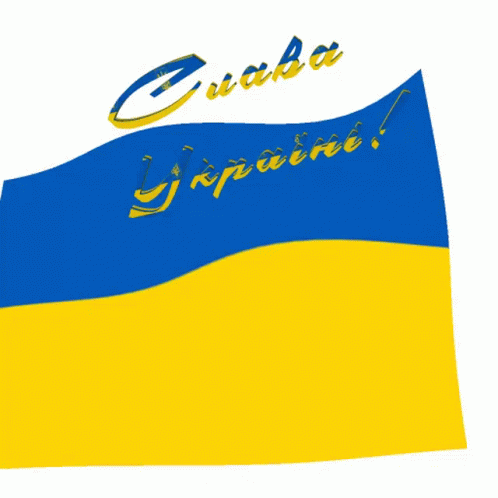 Ukrainian flag with the phrase 'Glory to Ukraine!' (Слава Україні!) written on it.