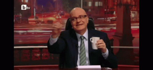 Slavi Trifonov, a man in a suit, holds a cup of coffee on the bTV set.