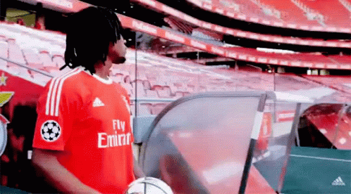 Renato Sanches in his SL Benfica jersey, holding a football in the stadium tunnel.