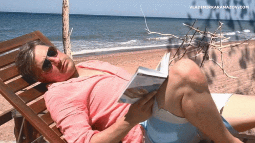 Vladimir Karamazov relaxes on a beach lounge chair, falling asleep while reading a book by the sea.