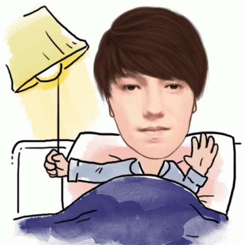 Dimash in a cartoon illustration, turning off his lamp and wishing 'Good Night' before going to sleep.