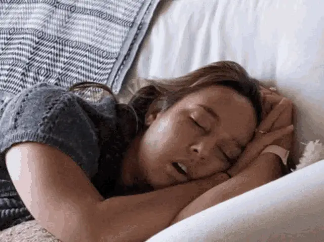 Gabriella Demartino looks sleepy while waking up in bed, covered by a white blanket.