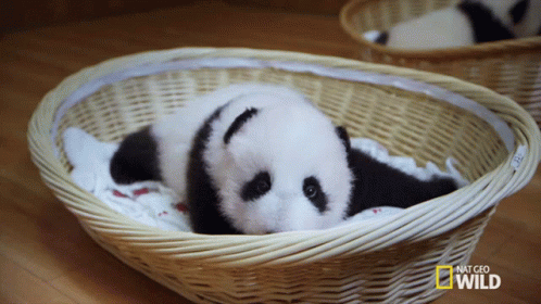 An adorable baby Giant Panda is seen resting sleepily in a wicker basket, captured by Nat Geo Wild.
