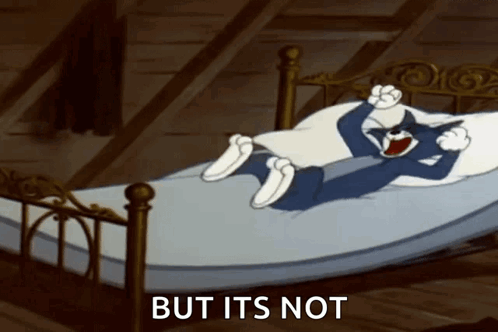 Tom the cat waking up and stretching in bed, with the caption 'BUT ITS NOT'. A classic cartoon moment.