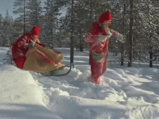 Elves in red suits struggle with a sleigh full of gifts in a snowy forest, leading to a comical fail.