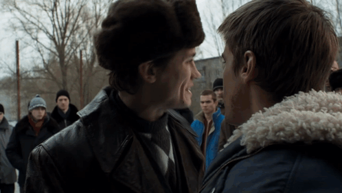 Koshchey from 'Slovo Patsana' confronts another man in a snowy street, surrounded by a crowd.