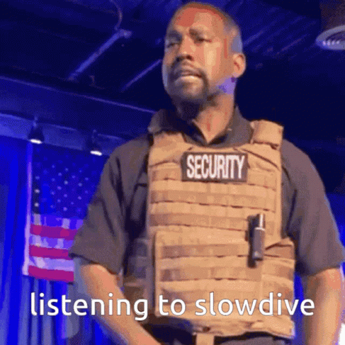 Kanye West, wearing a security vest, gets emotional while listening to the shoegaze band Slowdive.