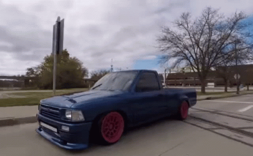 A custom blue Toyota minitruck by Slowpokeproduction, featuring pink wheels and a lowered suspension, drives down a street.