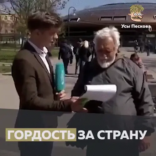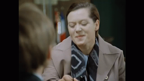 A woman in a trench coat and scarf playfully interacts with a man, making a funny face with scissors.
