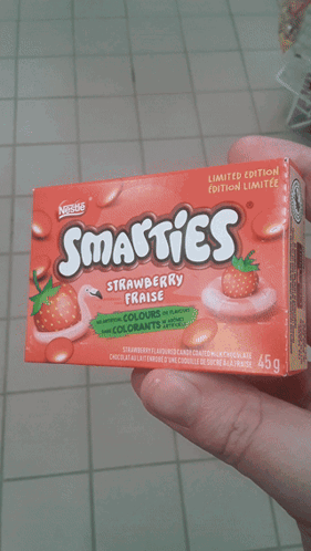 A hand holds a limited edition box of Nestlé Strawberry Fraise Smarties candy, highlighting its natural colors.