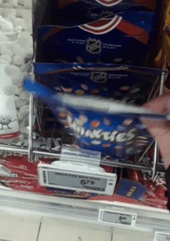 A hand holds a blue bag of Nestle Smarties candy, featuring an NHL hockey jersey design.
