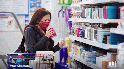 A woman in a red mask shops at Superstore, carefully smelling a scented candle from the shelf.