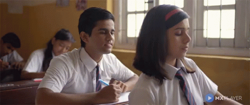 A boy discreetly smells his classmate's hair in a classroom, smiling as he enjoys the fragrant scent.