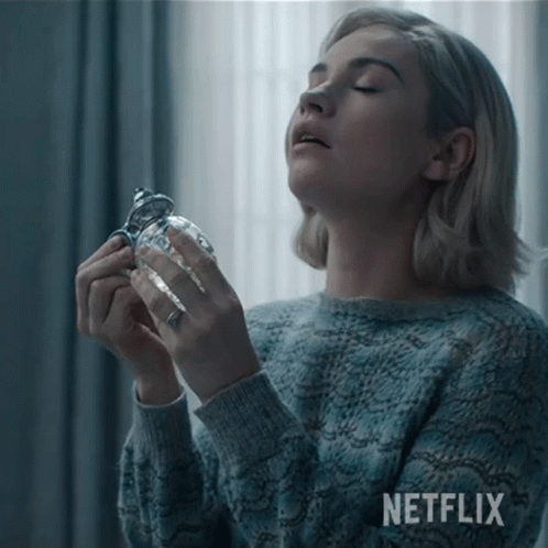 Lily James, as Mrs. De Winter, smells a perfume bottle with her eyes closed in a scene from Netflix's Rebecca.
