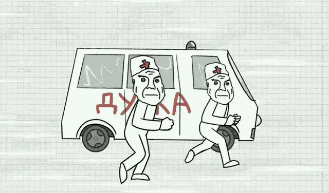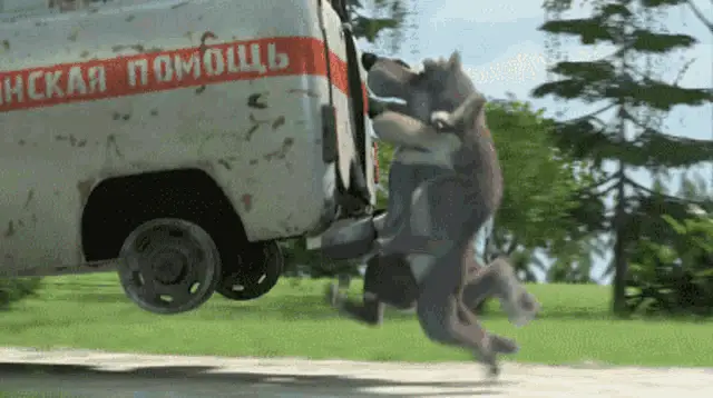 Animated Smeshariki characters driving a vehicle, appearing on a rescue mission.