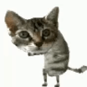 A small, pixelated tabby cat stands on its hind legs, appearing to dance or move its paws on a white background.